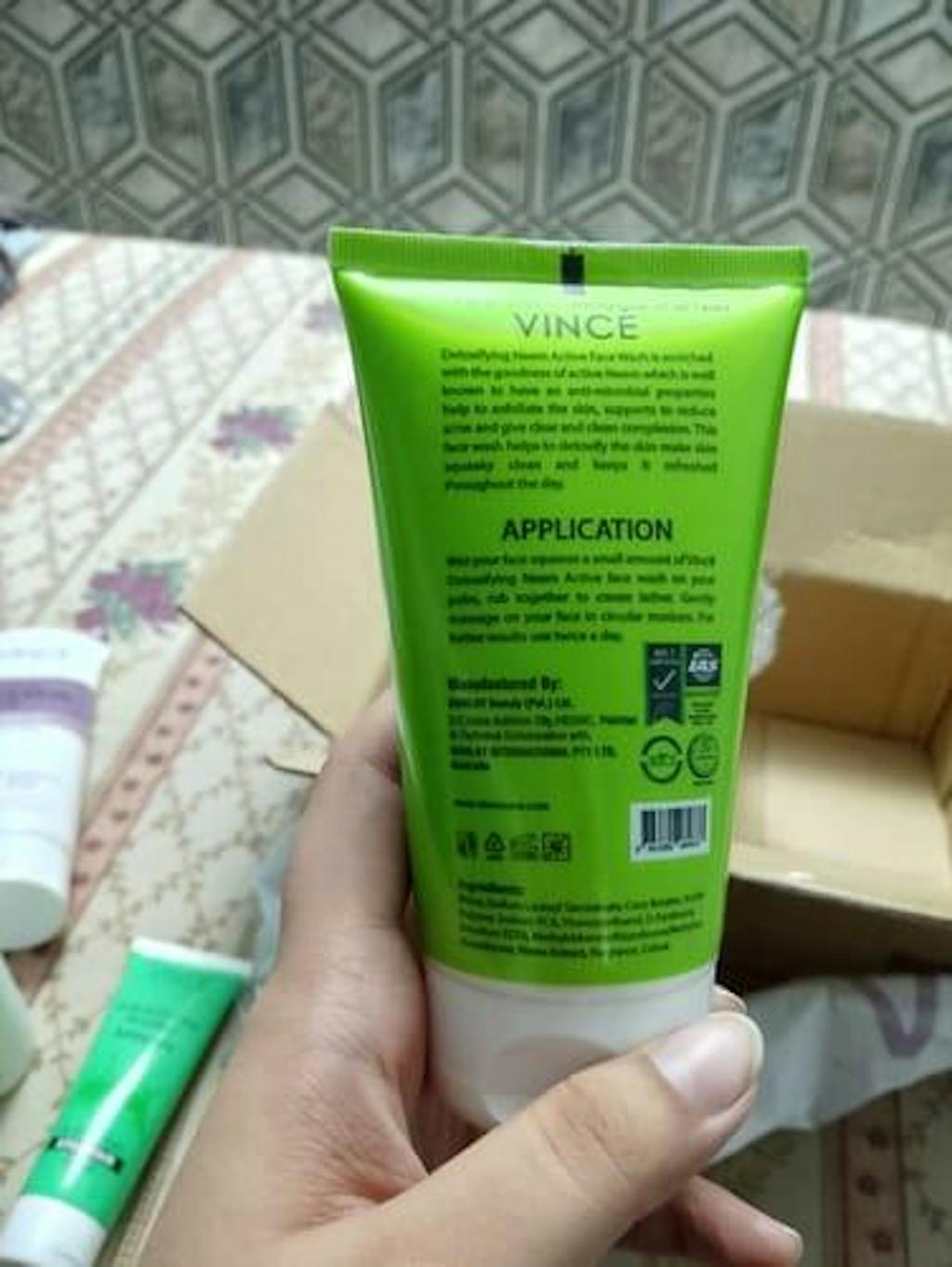 Wet your face squeeze a small amount of Vincé Detoxifying Neem Active face wash on your palm, rub together to create lather. Gently massage on your face in circular motions. For better results use twice a day.